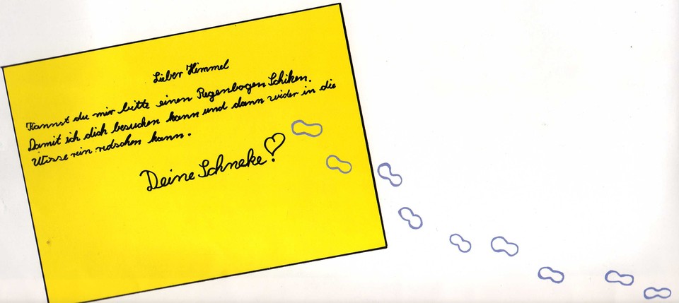 Die Ameisen und Käfer, die Bienen und Libellen, die der kleinen Schnecke schon seit einigen Tagen zuschauten, staunten nun sehr. Nur der Grasfrosch konnte lesen und rief ganz aufgeregt: >Sie schreibt einen Brief!< Und er las den anderen vor: